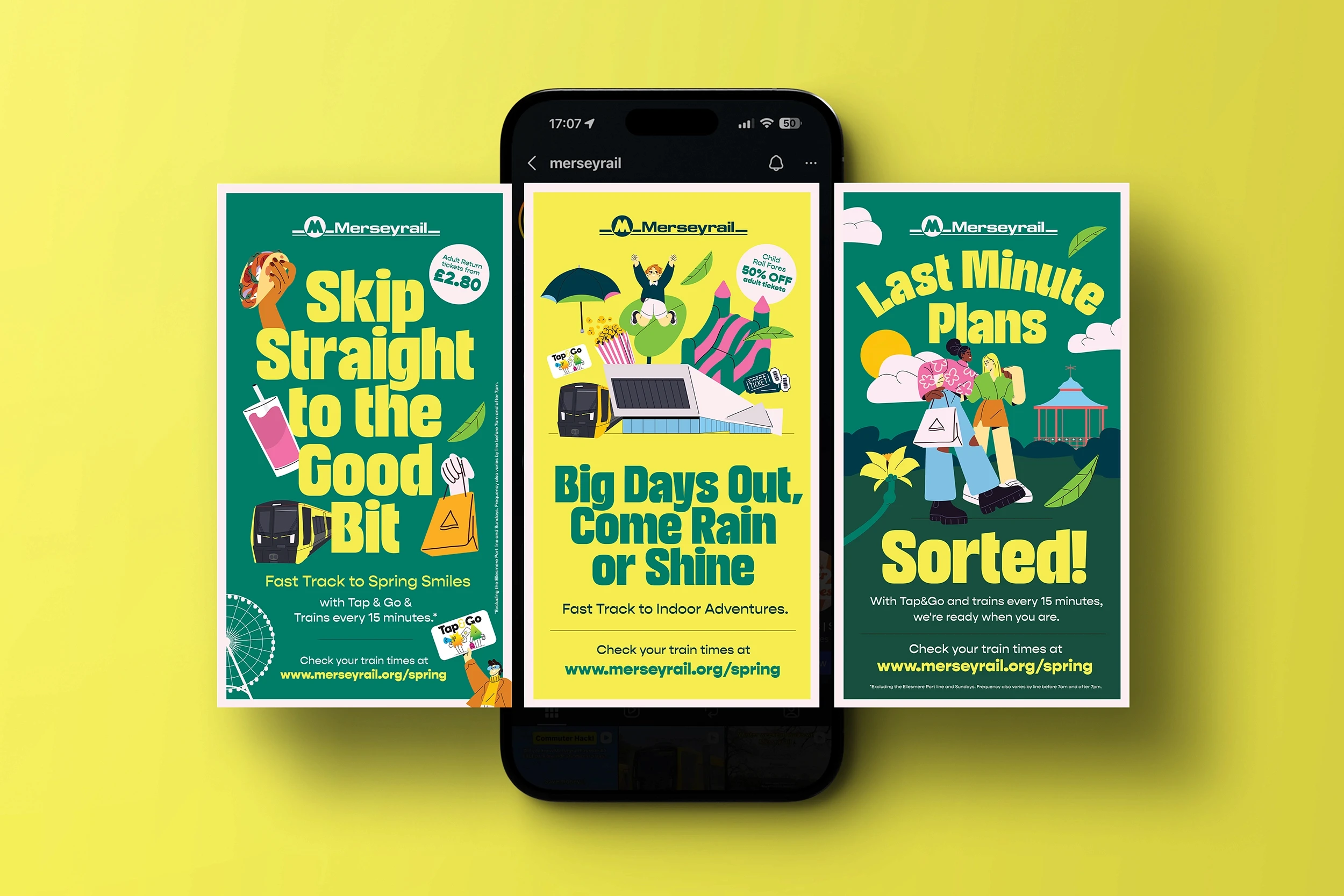 The creative approach combines bespoke illustration with photography to create a bright, ownable campaign style that helps position Merseyrail as the easy, enjoyable choice for leisure travel across the region.